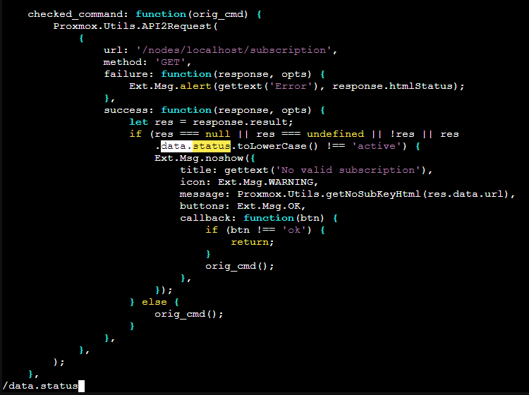 由于并未订阅,每次进入 PVE 界面都需要手动叉掉订阅通知,这里可以通过修改 /usr/share/javascript/proxmox-widget-toolkit/proxmoxlib.js 来删除订阅通知